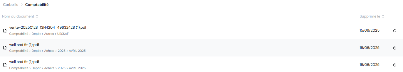 Retrouvez dans la corbeille "Comptabilité" les documents préalablement supprimés.