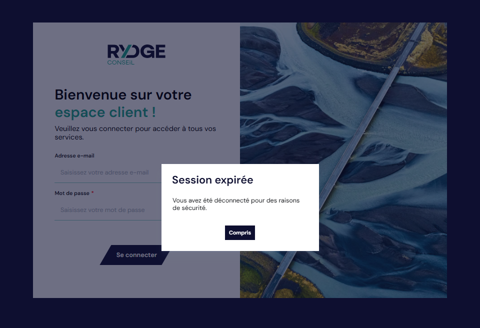 Tant que vous utilisez la plateforme RYDGE Conseil, vous restez connecté. Après un délai d'inactivité entre 30 minutes et 1h30, vous serez automatiquement déconnecté.