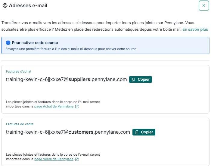 Retrouvez également vos adresses Mail2GED depuis "paramètre entreprise" > "transmission de factures" sur Pennylane.