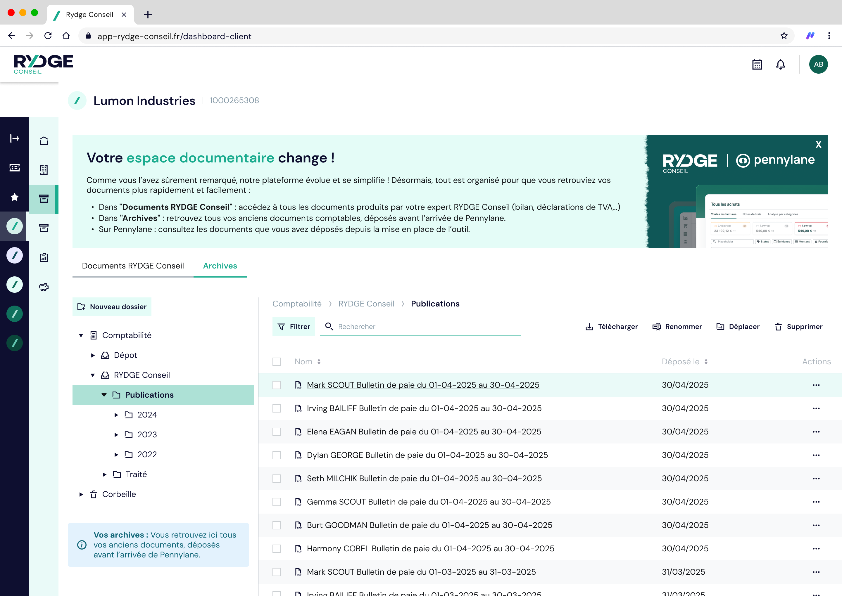 Où retrouver ses documents déposés sur la plateforme RYDGE Conseil avant l'arrivée de Pennylane ?