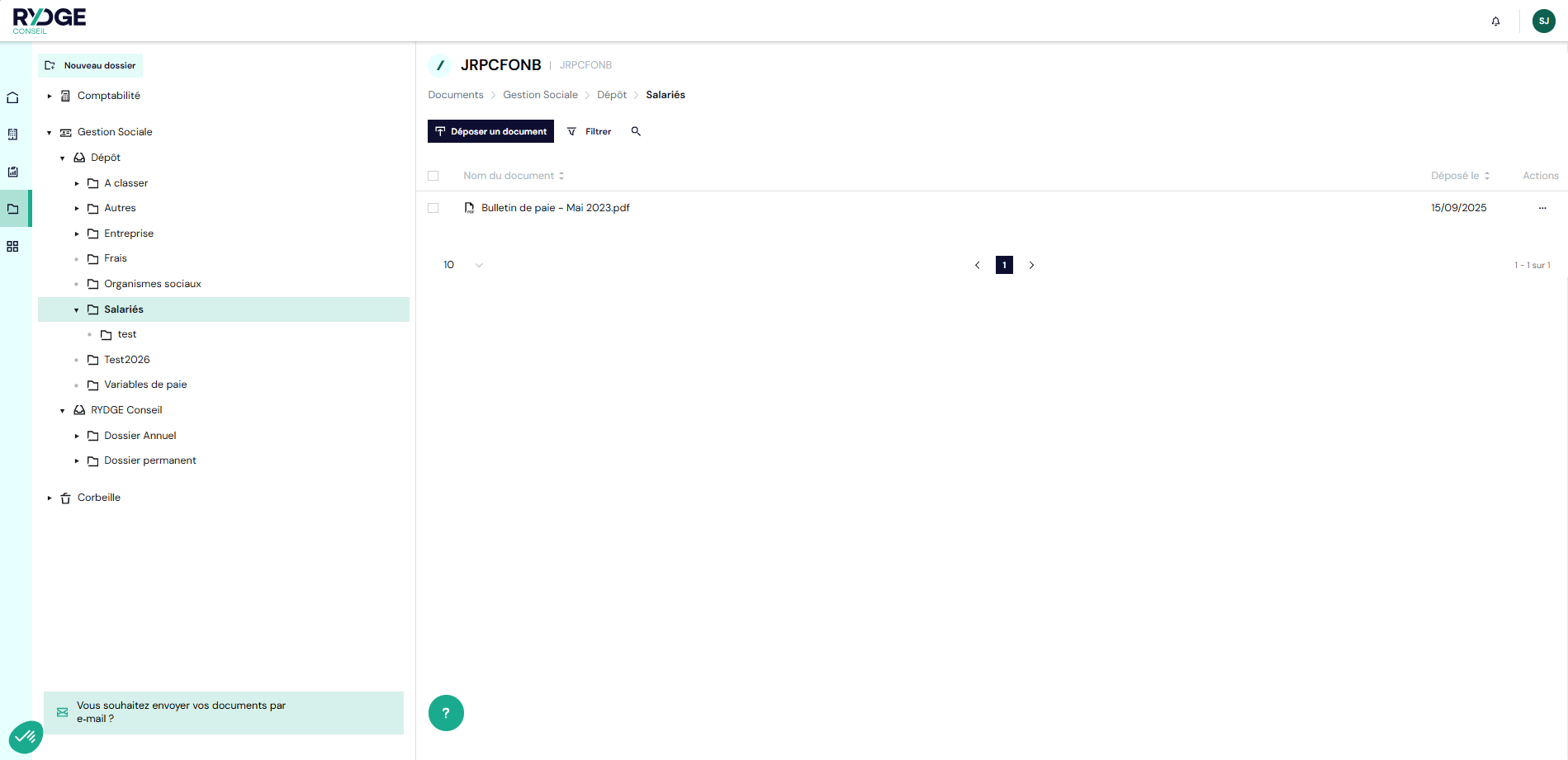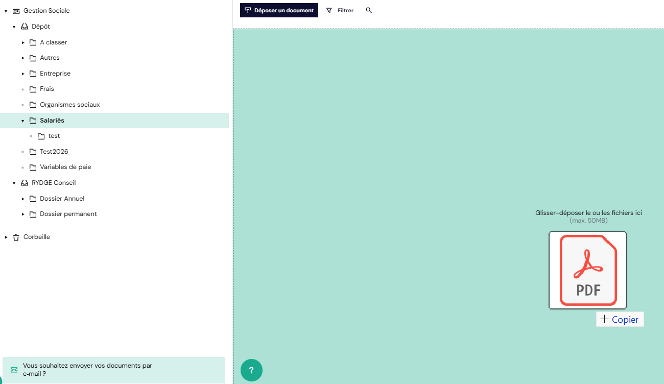 - La consultation des documents déposés par votre Gestionnaire RYDGE Conseil (journaux et états de paie, déclarations sociales, contrats de travail, registre du personnel, note d'information RH, accords collectifs, rapports & tableaux de bord sociaux)