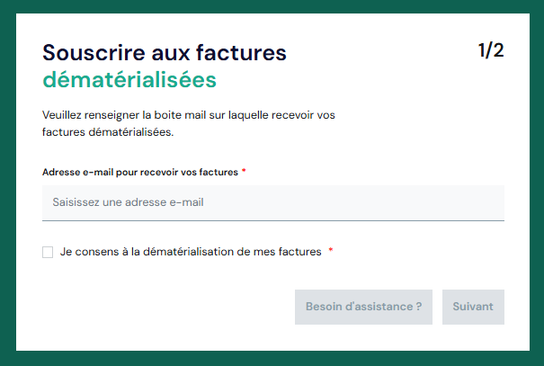 - Etape 1/2 : Saisissez l'adresse email de votre choix pour recevoir par email (sous format .pdf) vos factures RYDGE Conseil