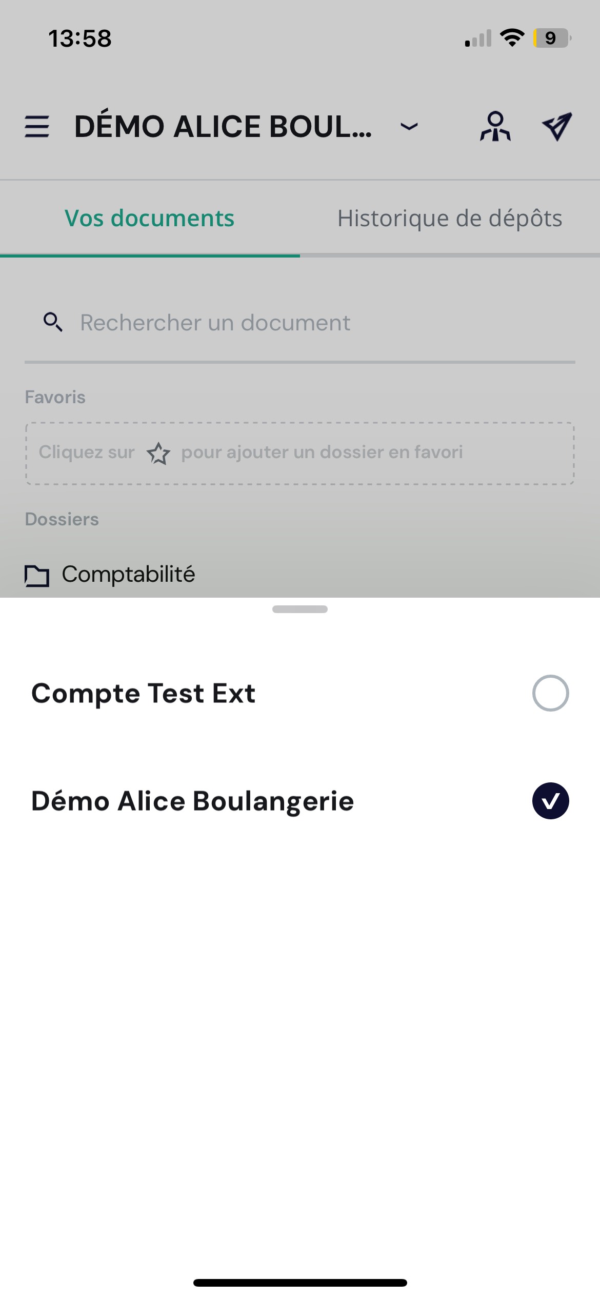 Une fois connecté, si vous avez plusieurs sociétés dont la gestion est opérée par notre cabinet, vous avez la possibilité de choisir à partir de quelle entité vous agirez.